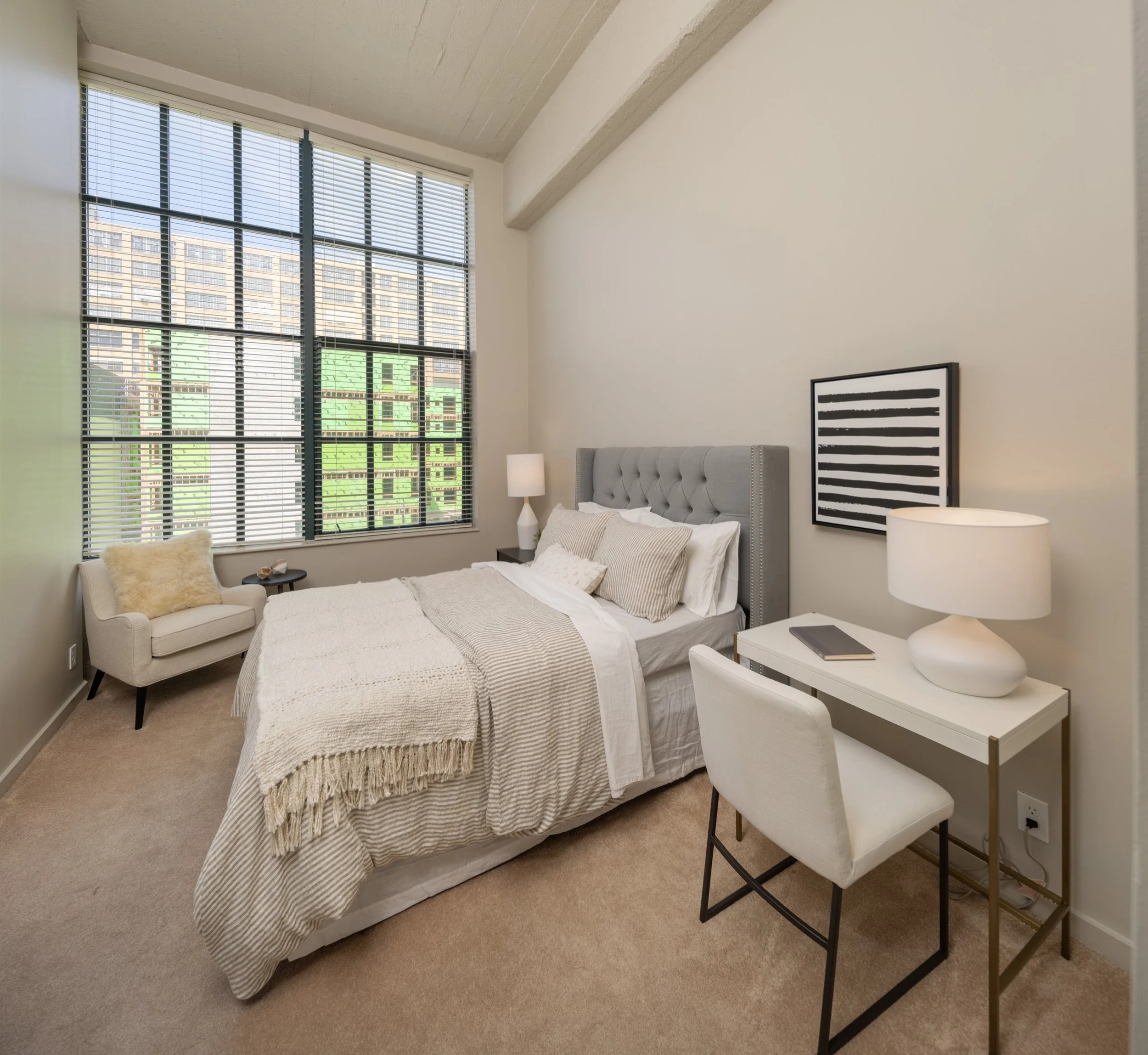 A spacious high-ceiling loft bedroom and enormous windows make starting each day a little brighter.