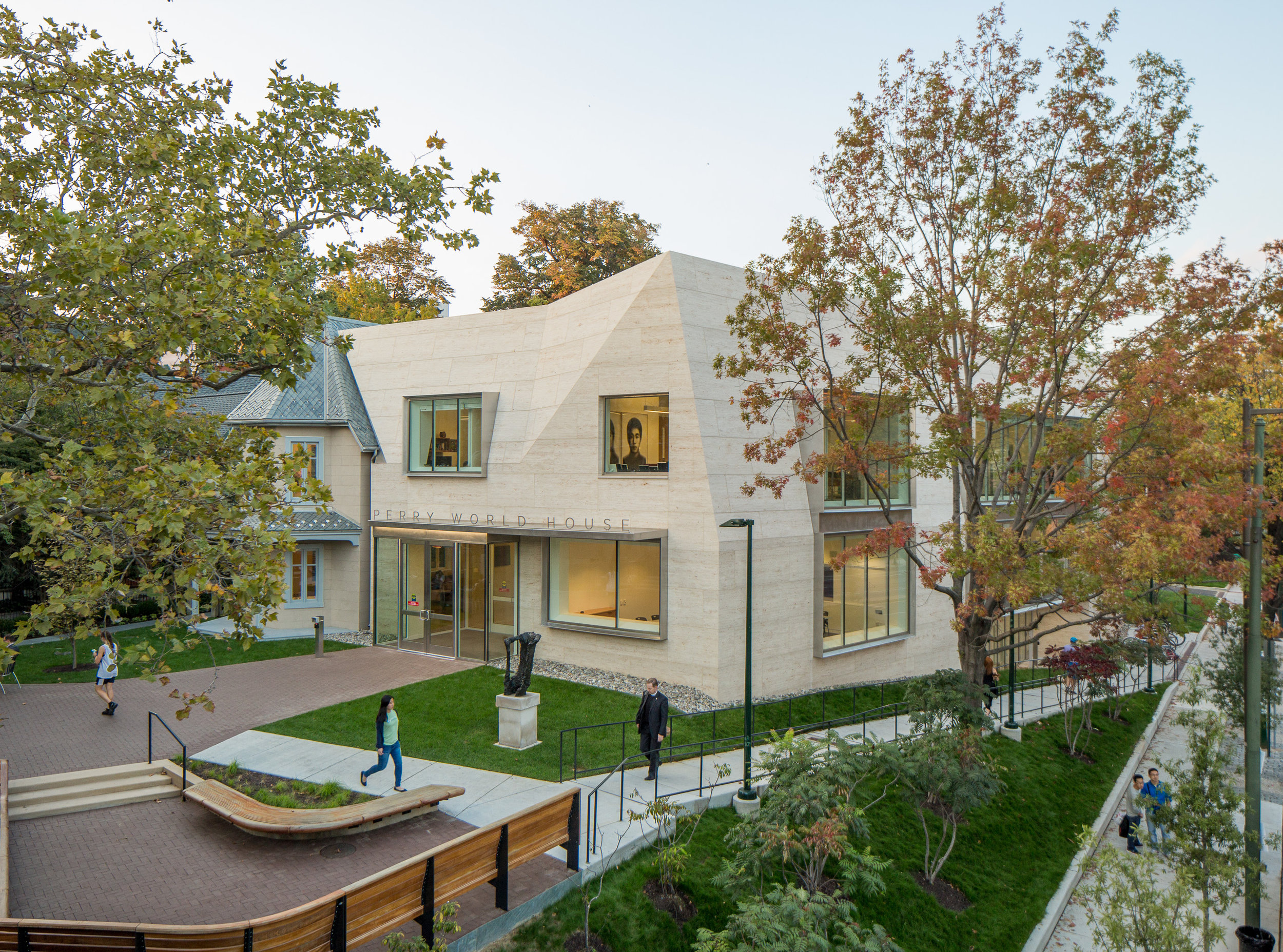 For the Architecture Firm: The building’s architects, 1100 Architect, elected to keep portions of an original 1851 brick-and-stucco cottage and fuse them into a thoroughly modern limestone building. In what’s been described as a “blunt collision” of old and new, its singular mission is to bring the entire University – all 12 schools – together to debate and explore global issues.