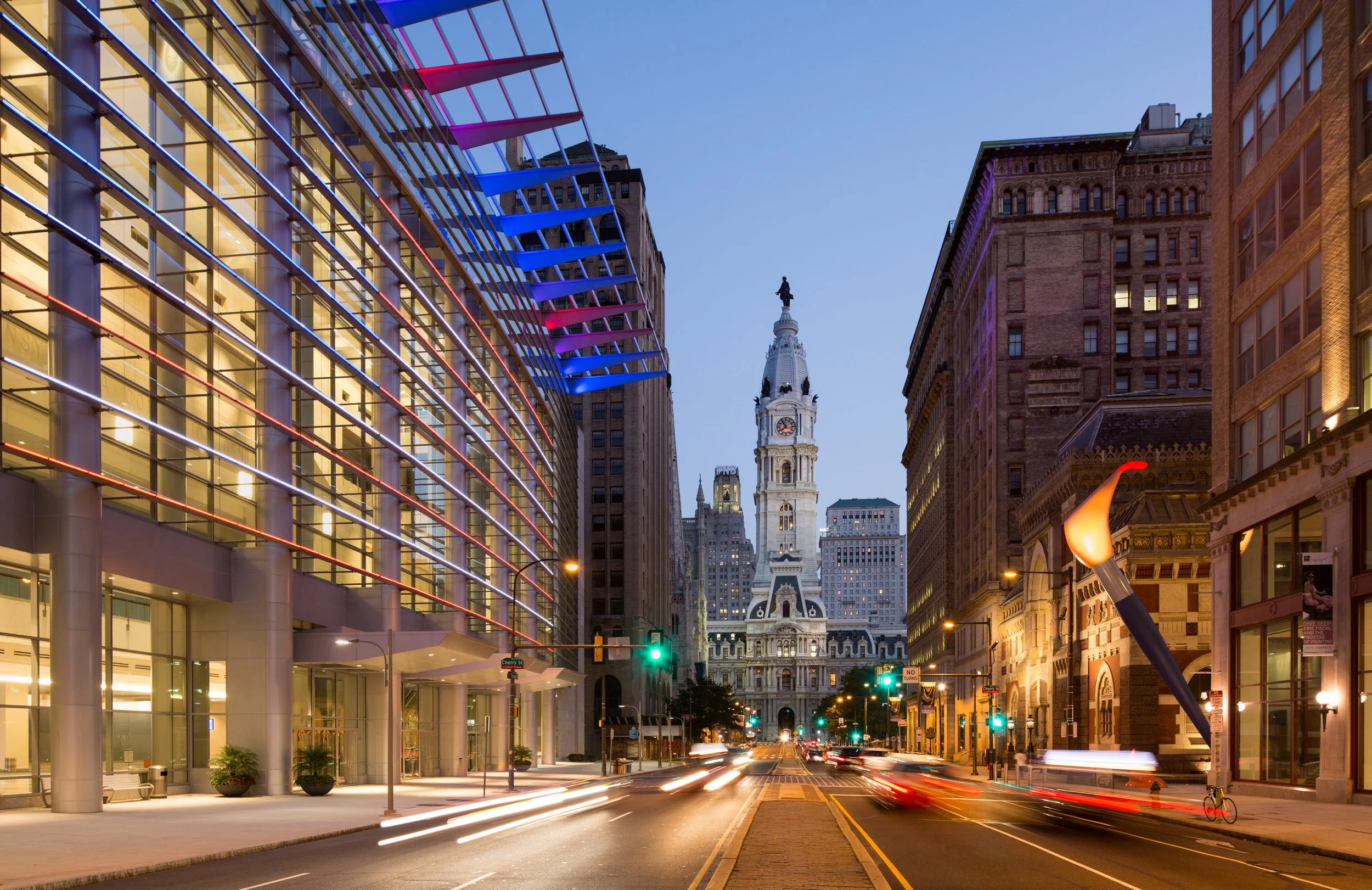 Philadelphia’s Convention Center and the Oldenburg paintbrush sculpture frame City Hall.
