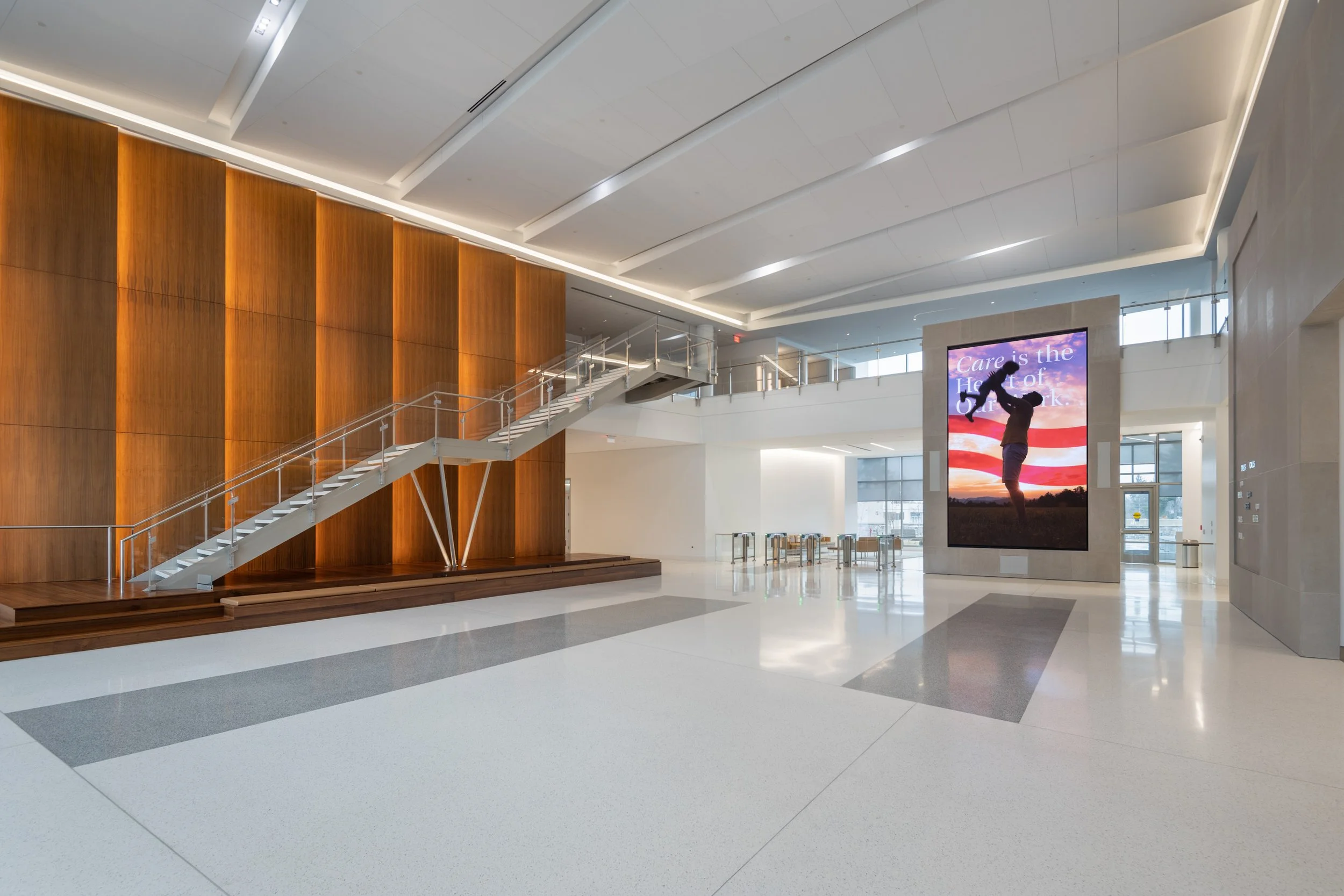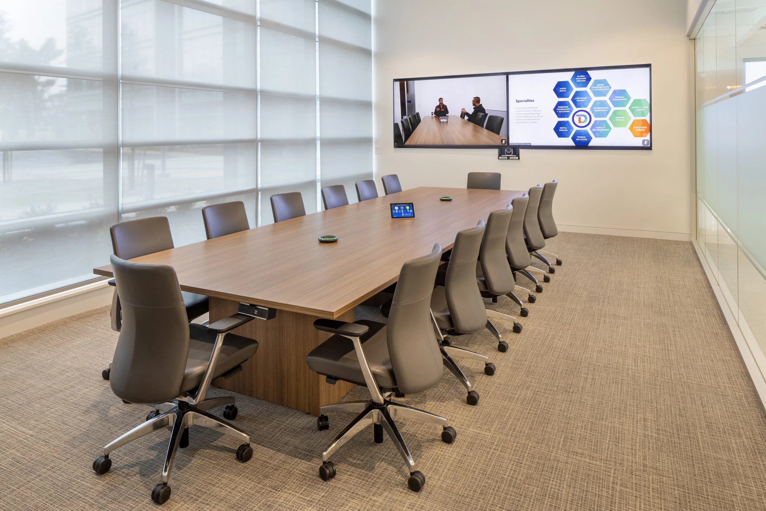 Ever try to photograph another device's screen and get frustrated when you see wavy lines and glare instead? A common phrase used in many smartphone advertisements is “Screen images simulated,” meaning that post-production effects are used to avoid this result. I had this challenge photographing a recent projector and screen installation by Diversified at a local office building.