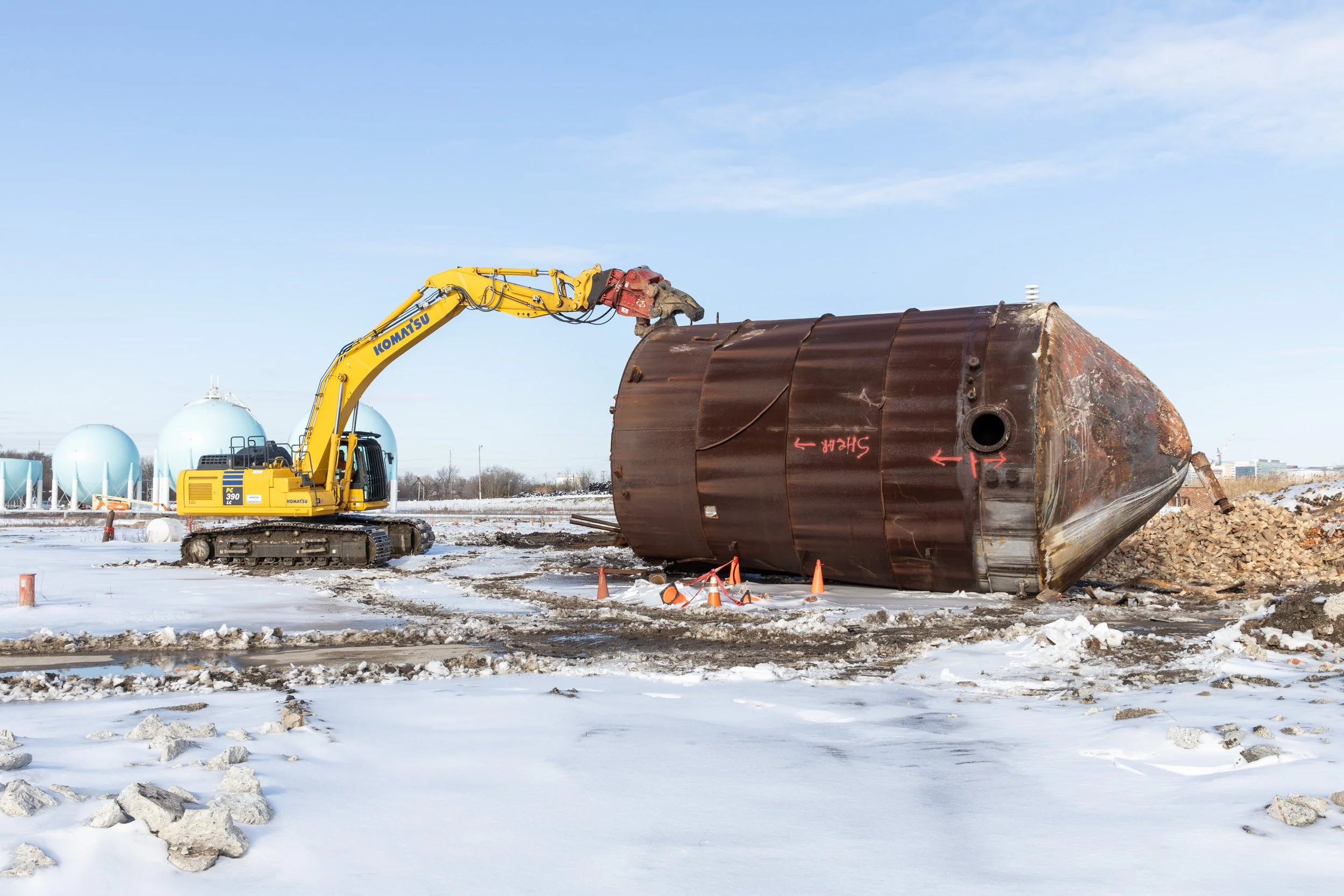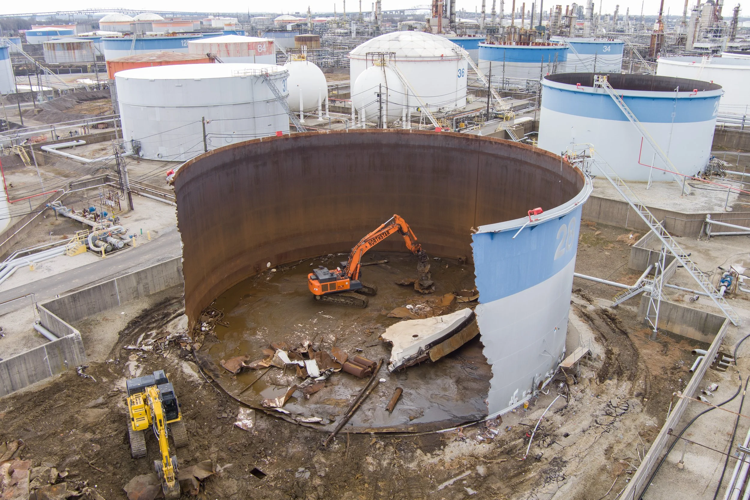 Compared to the giant storage tank it is demolishing, this excavator looks like a child’s toy.