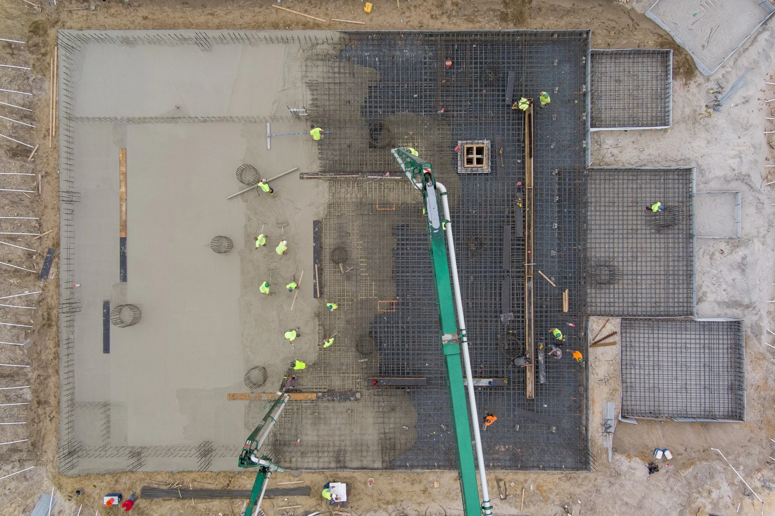 From my drone’s vantage point, the construction workers look like busy bees in their bright safety vests!