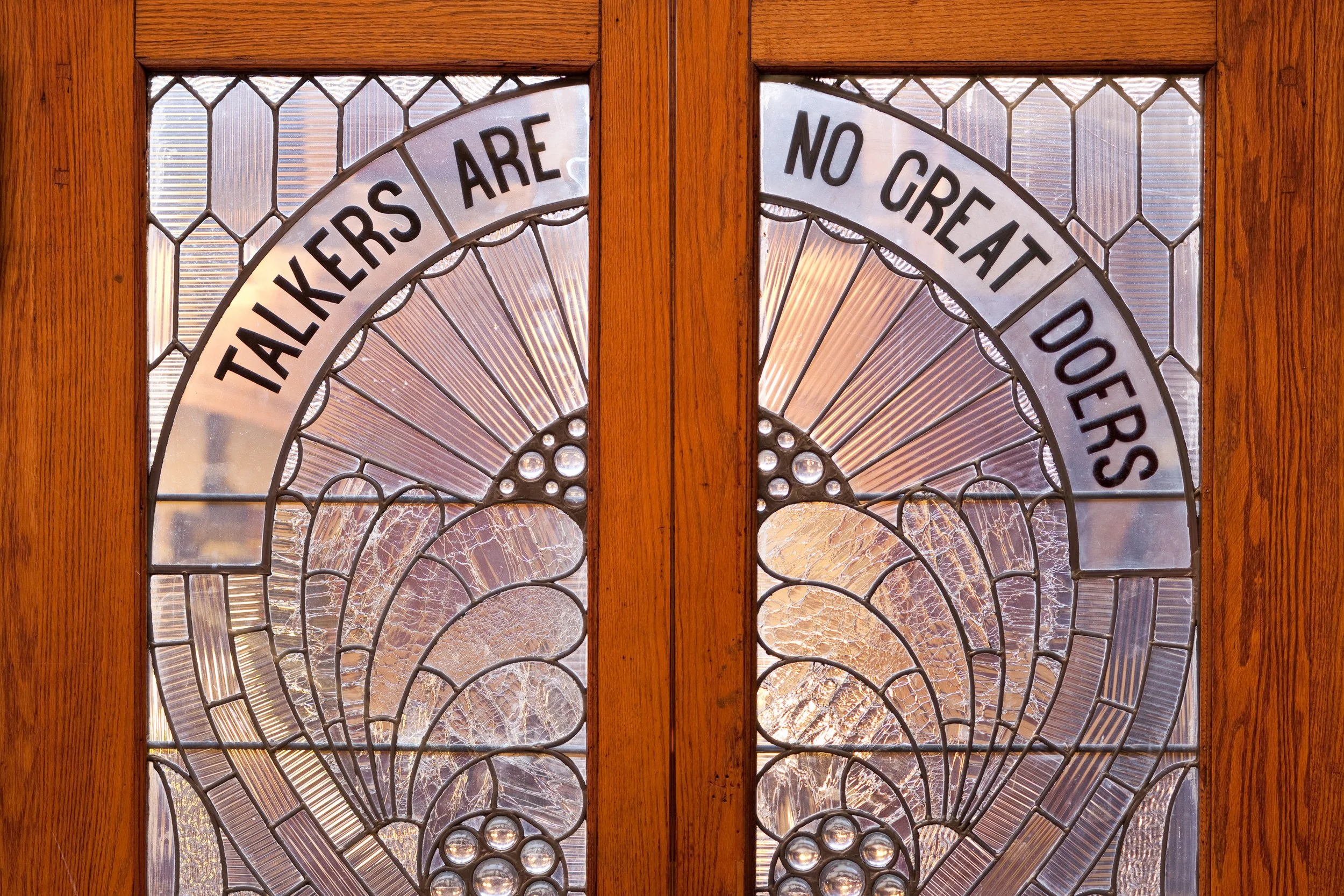 At twilight, interior lights illuminate the gorgeous detail of the library’s decorative windows.