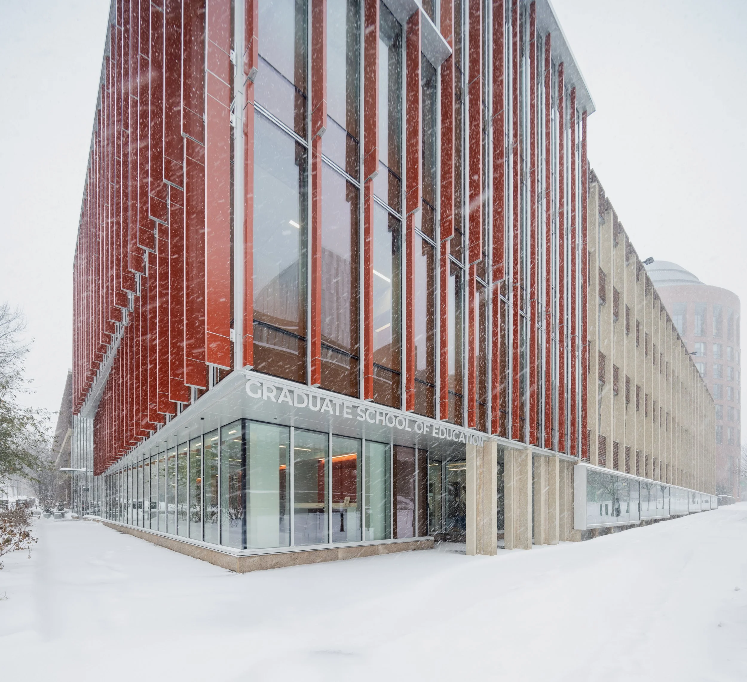 The Graduate School of Education’s bright red exterior panels stand out even more in the snow.