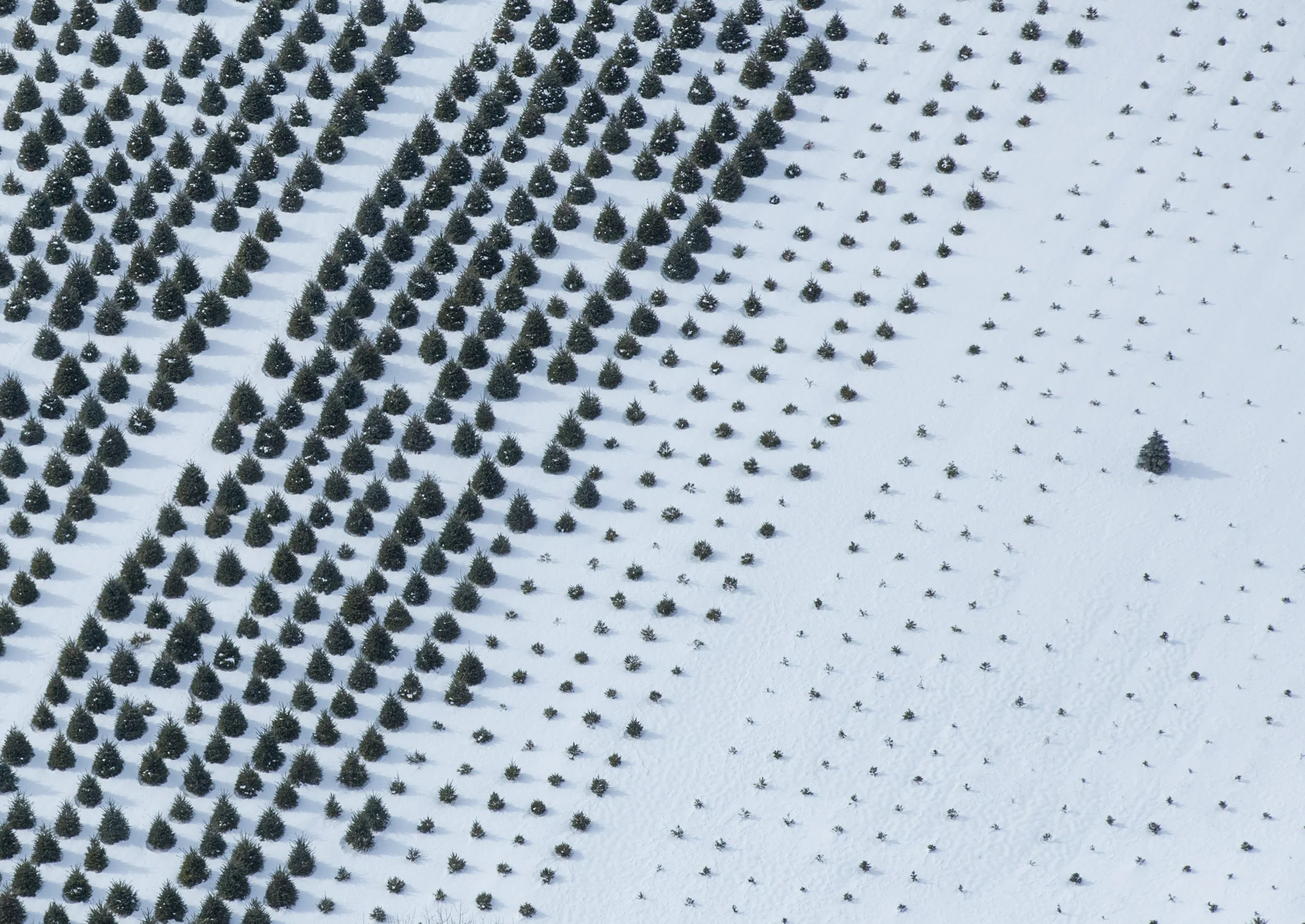 Above a farm in Readington Township, NJ, stages of the Christmas tree growing process are clearly visible in the snow.