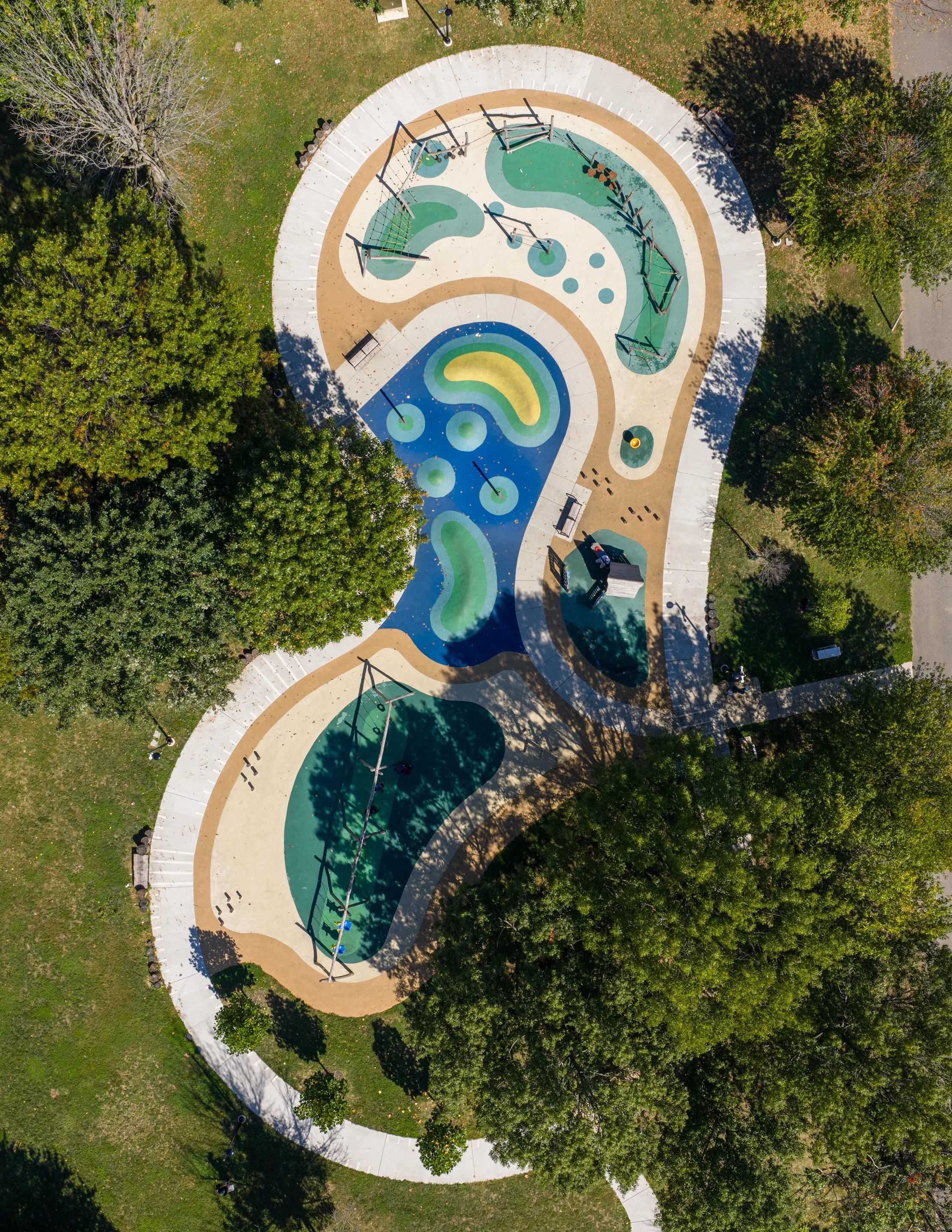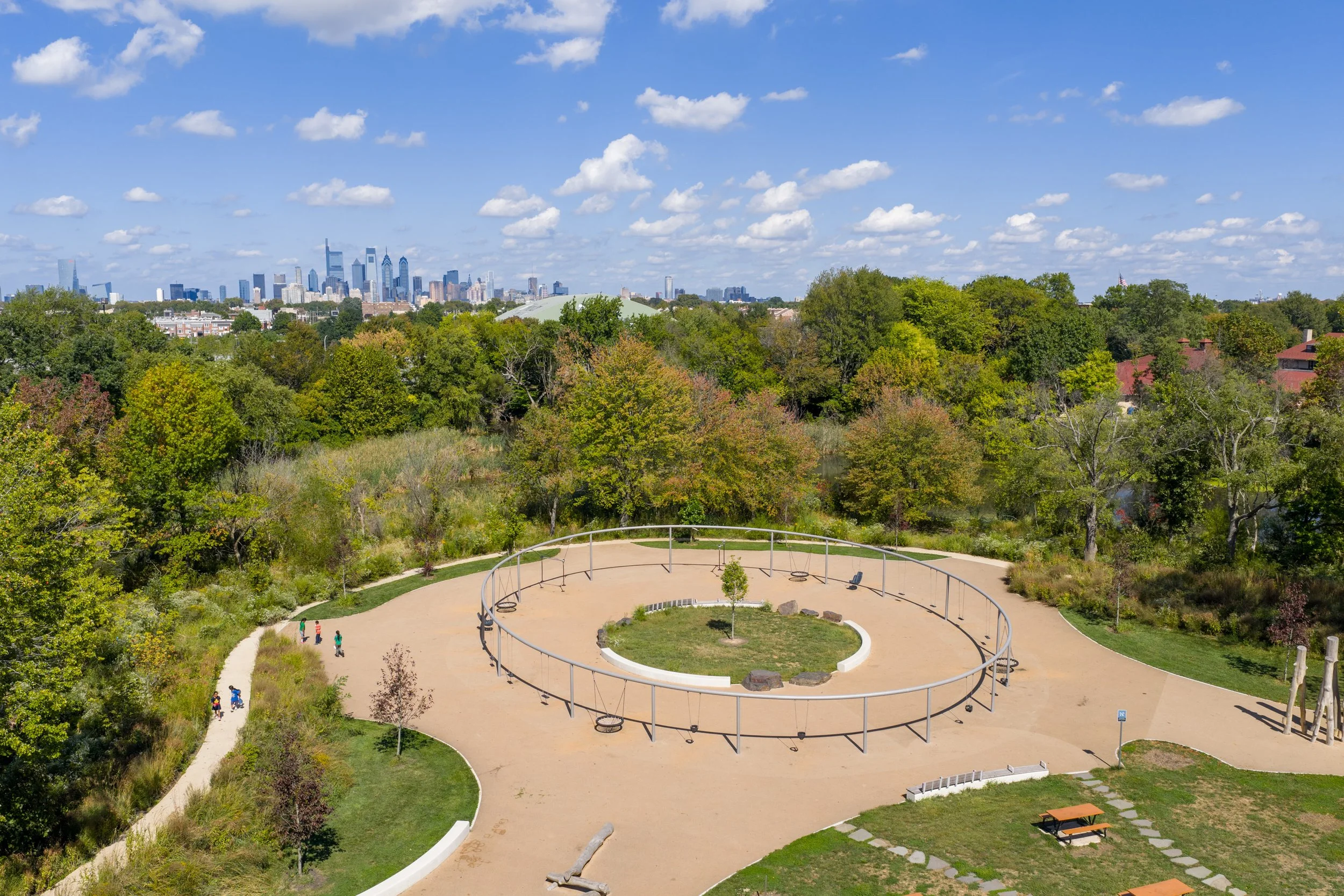 Above Cobbs Creek Park in West Philadelphia, the brightly colored surfaces that mark the playground’s different spaces provide a fun contrast amid the surrounding tree canopy.