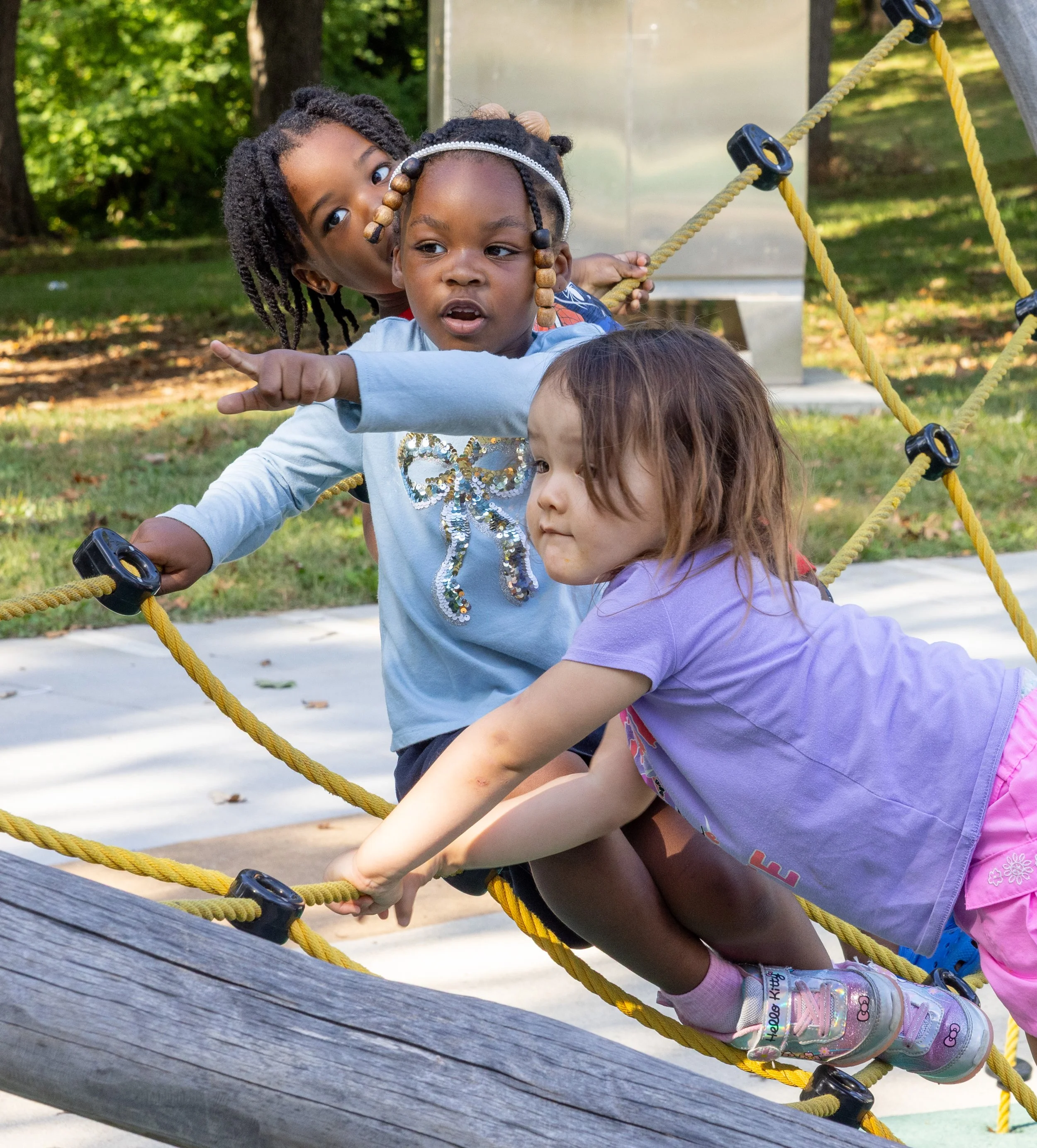Rope-and-wood climbing structures invite curiosity and imaginative play.
