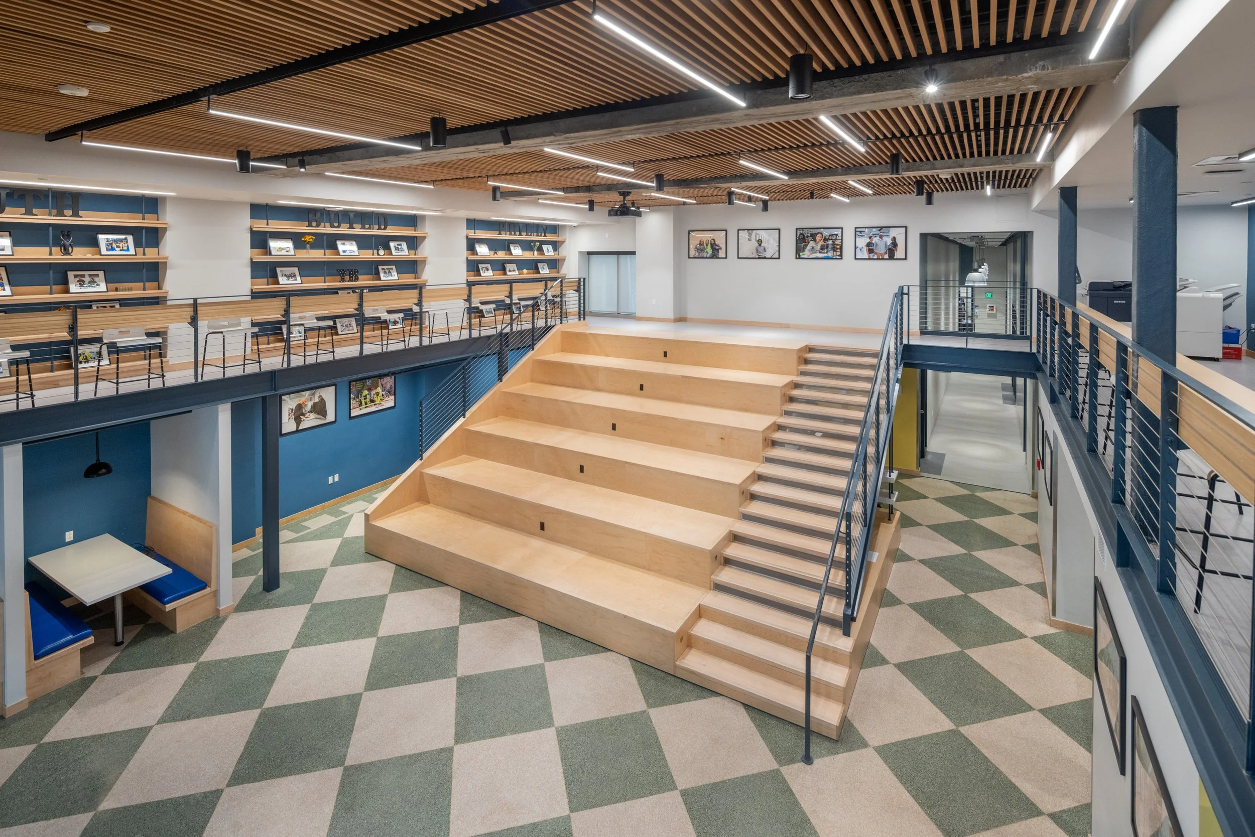 The new home of YouthBuild Philly Charter School was designed to provide hands-on learning opportunities and dedicated spaces across the school’s many disciplines, so we directed our photoshoot with that goal in mind. Like a similar renovation at the University of Pennsylvania, the design revamped a spacious older structure to build communal areas that encourage both collaborative learning and informal interaction.