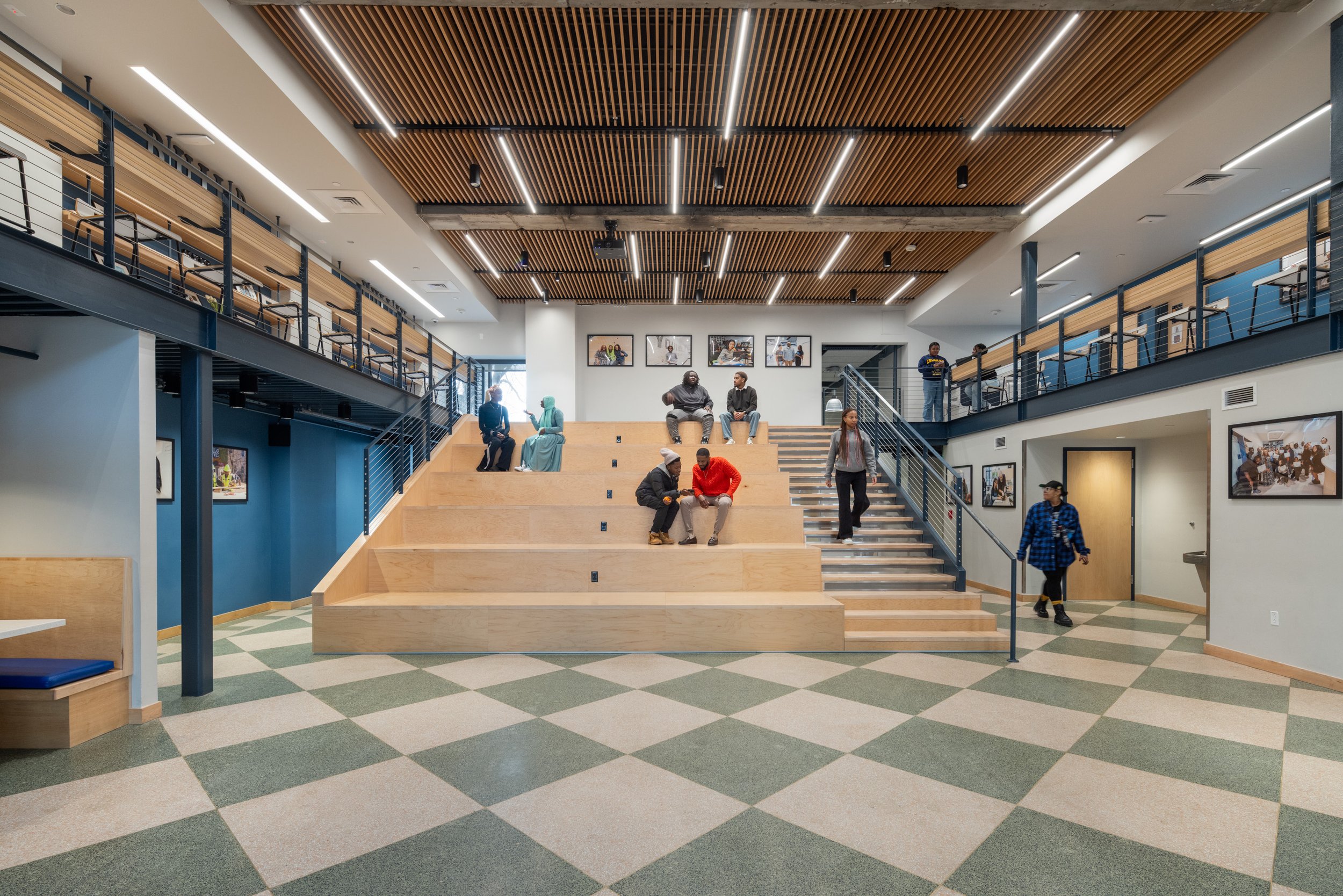 While removing people from photos can sometimes help eliminate visual distractions, photographing a school in use highlights the practical results of thoughtful design details. YouthBuild provides academic courses and individualized holistic support in addition to vocational training, so it was important to show off the quieter, more intimate settings as well.