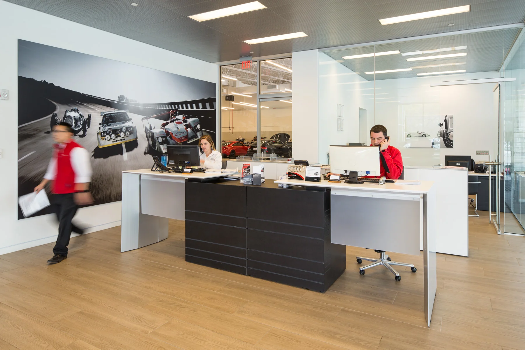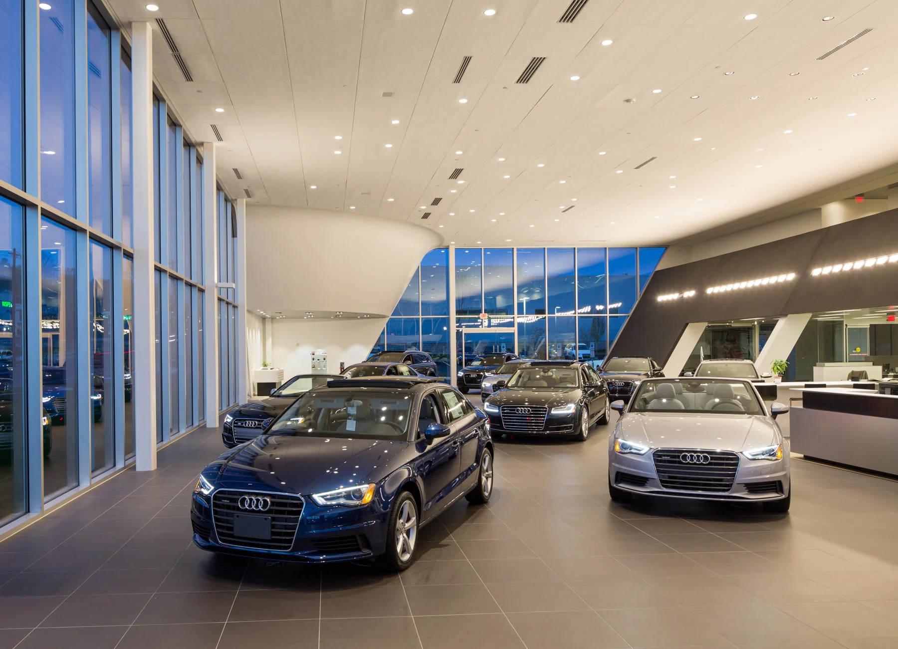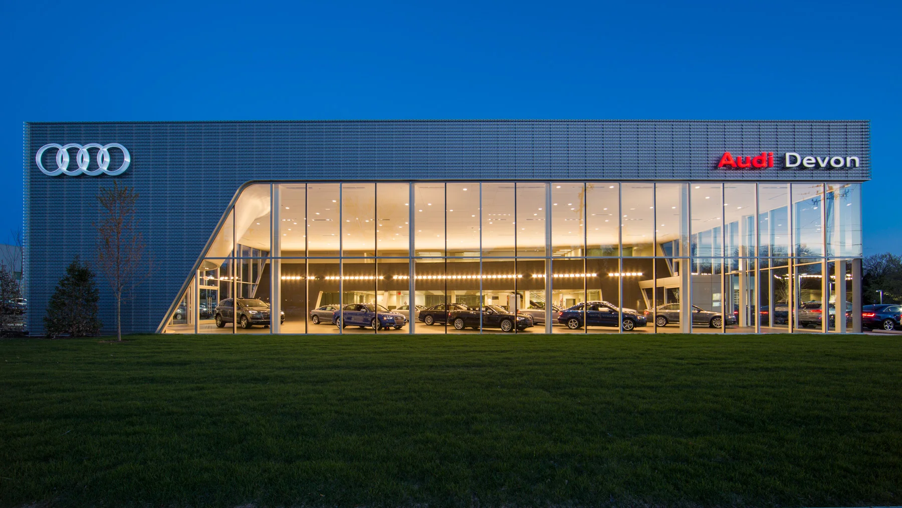 Cuing a backdrop of twilight, the photography team made the most of a 15-minute window of prime sunset coloration to peek in on a radiant performance of automotive design. Pouncing on a golden opportunity, a second team member snapped the showroom from inside as the indigo dusk made a cameo appearance through the window walls.