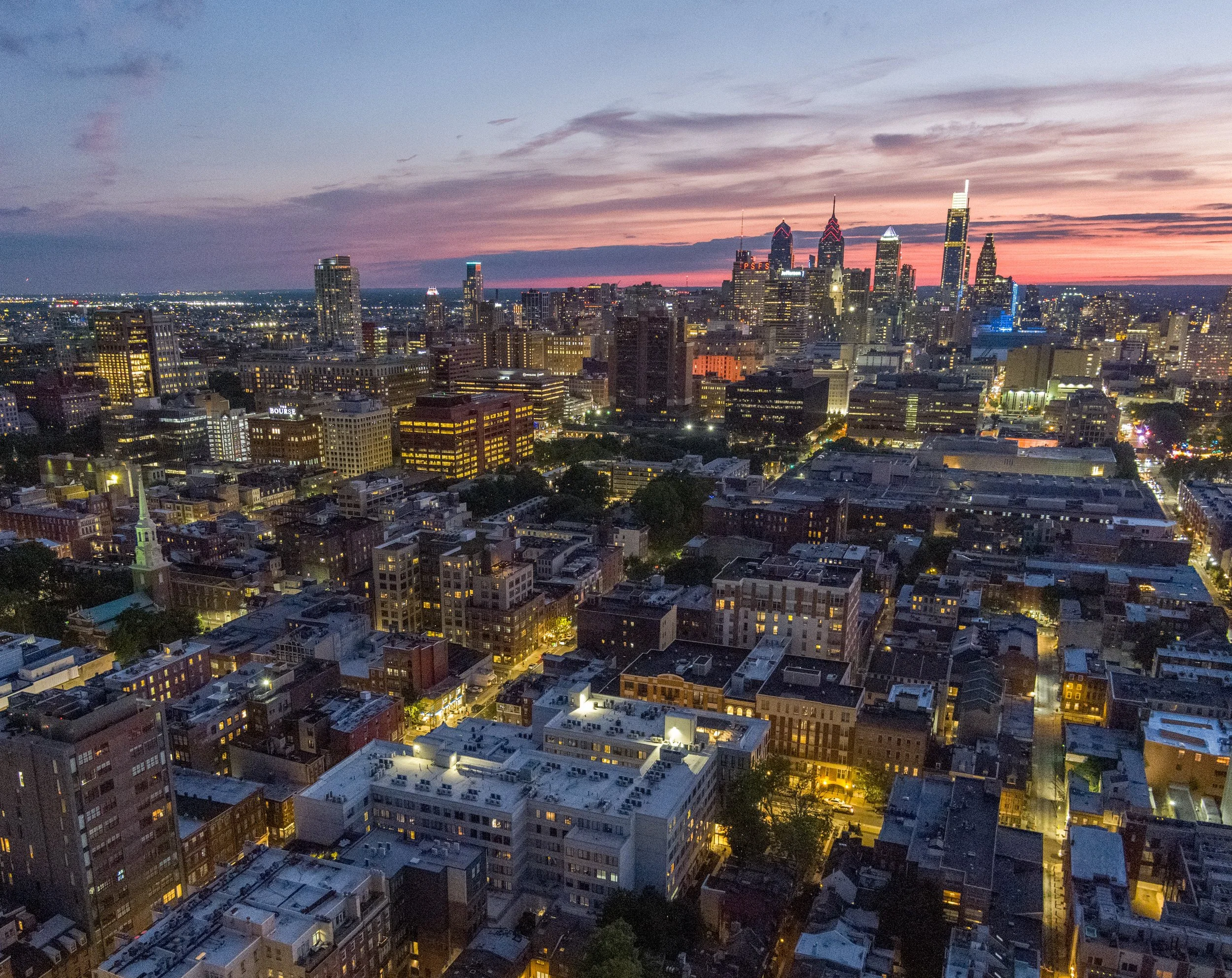 The lingering sunset highlights the Philadelphia skyline behind apartments in Old City.