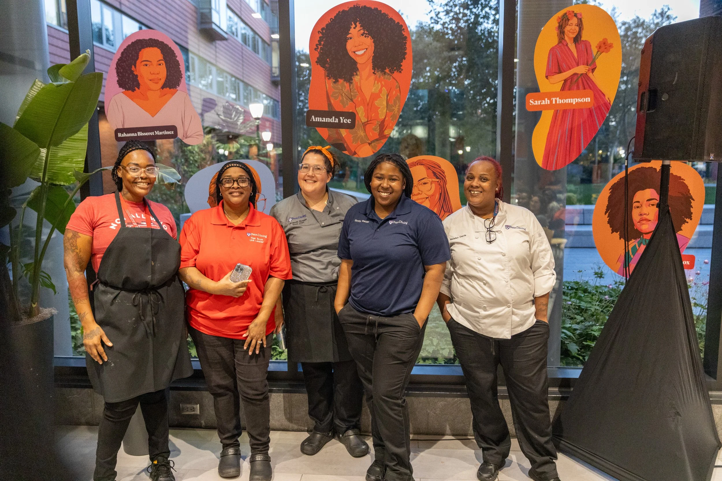 Penn Dining staff pose in front of a display celebrating fellow women and femmes in the culinary industry.