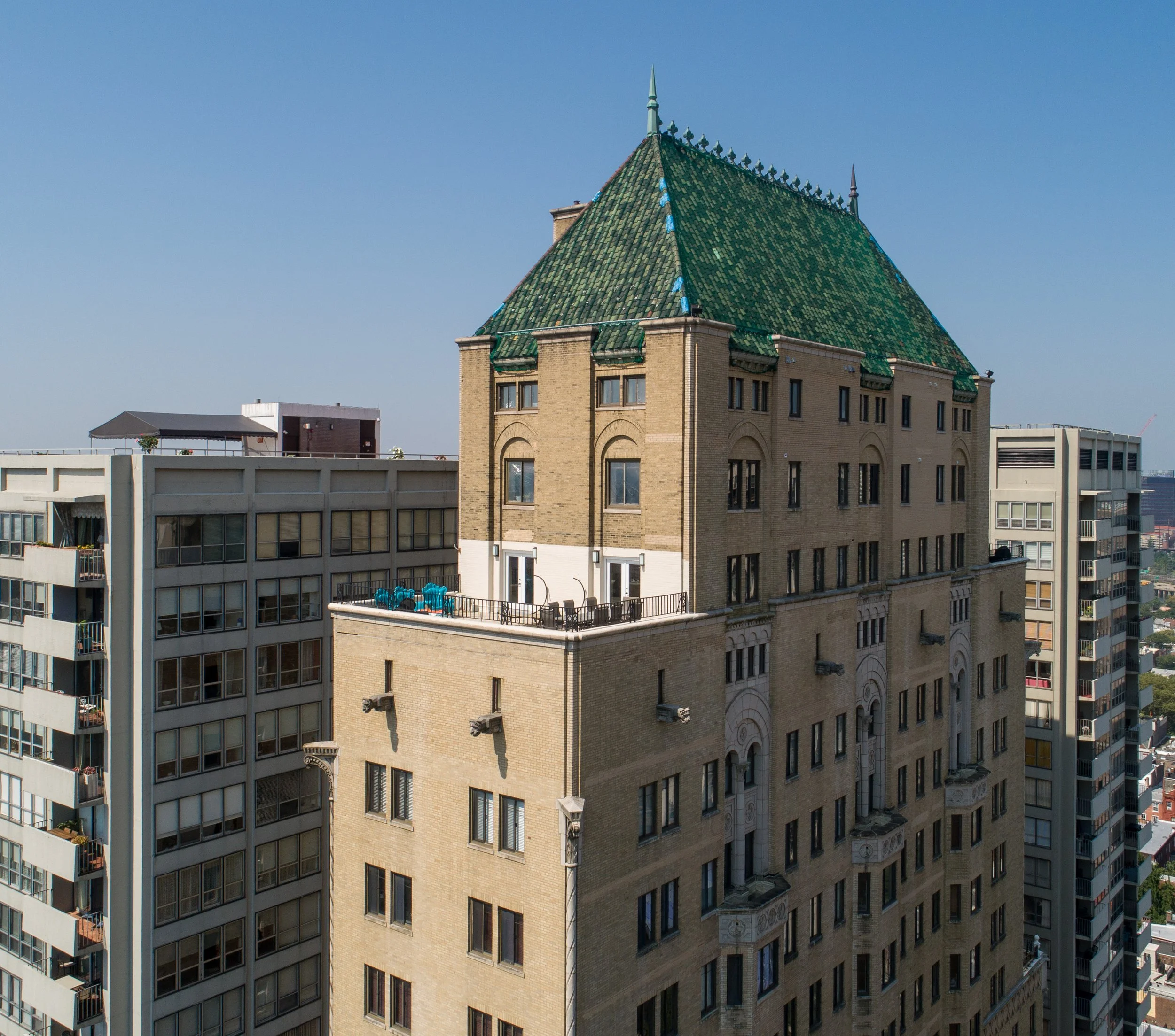 At 222 Rittenhouse Square, birds and drones alike can observe the tile roof and gargoyles…