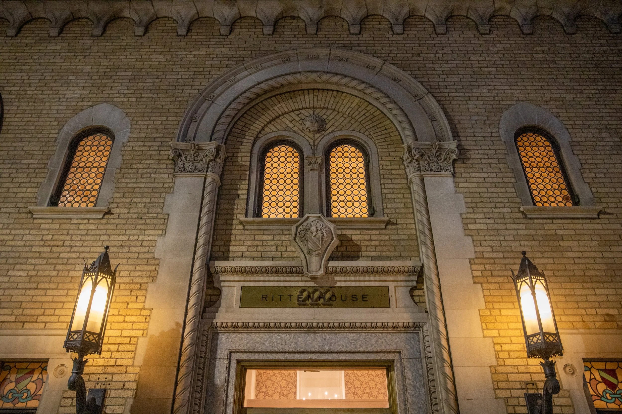 Incised stone details frame the entrance and windows of the Metropolitan in Center City.