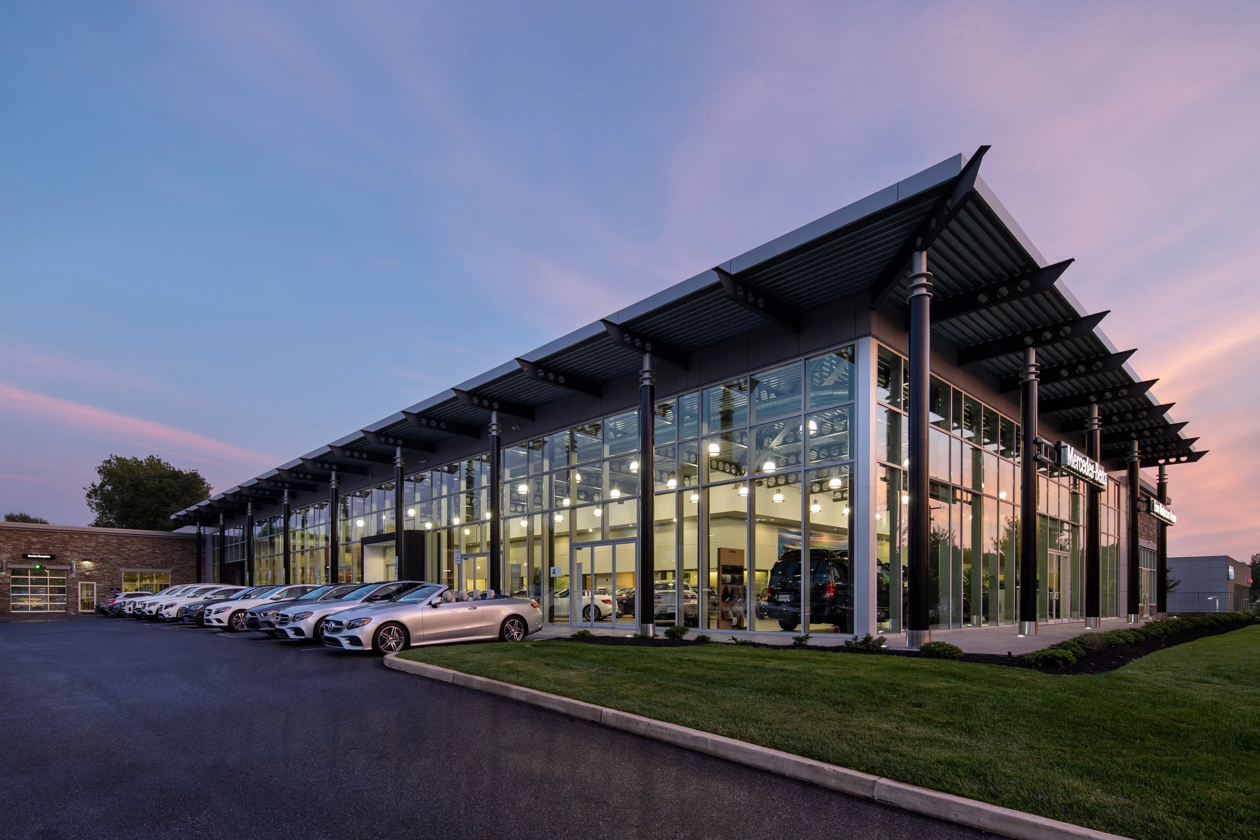 Twilight is the perfect time to see inside and outside the Euro Motorcars dealership in Bethesda, Maryland.