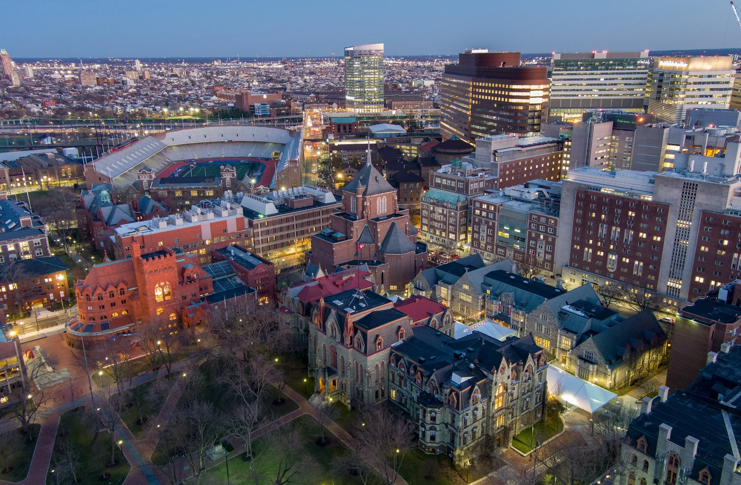 A drone’s-eye view highlights the eclectic mix of building styles on the University of Pennsylvania campus.