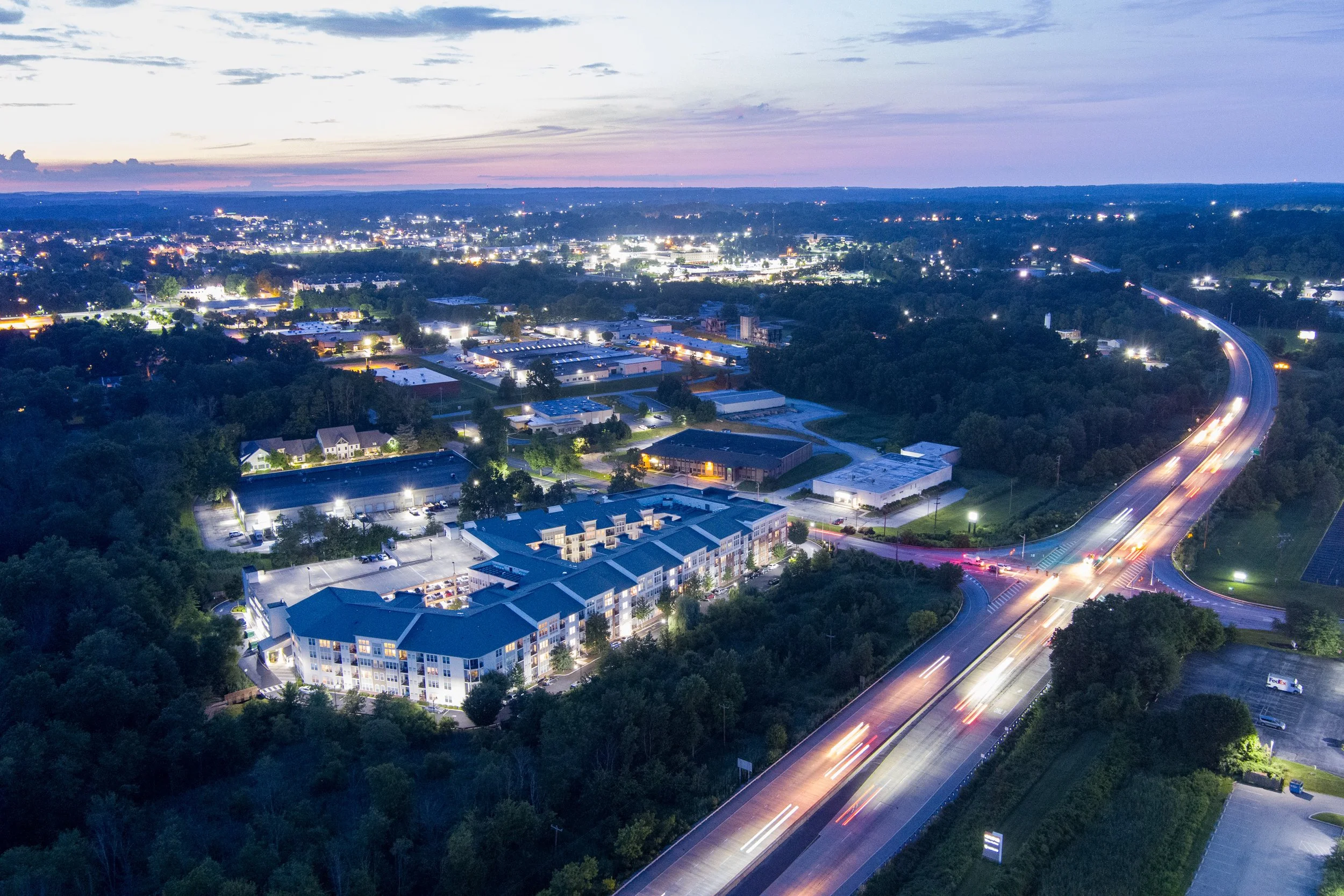The streaks of moving cars on the highway add interest to this overview of The Pointe, an apartment complex in West Chester, PA.
