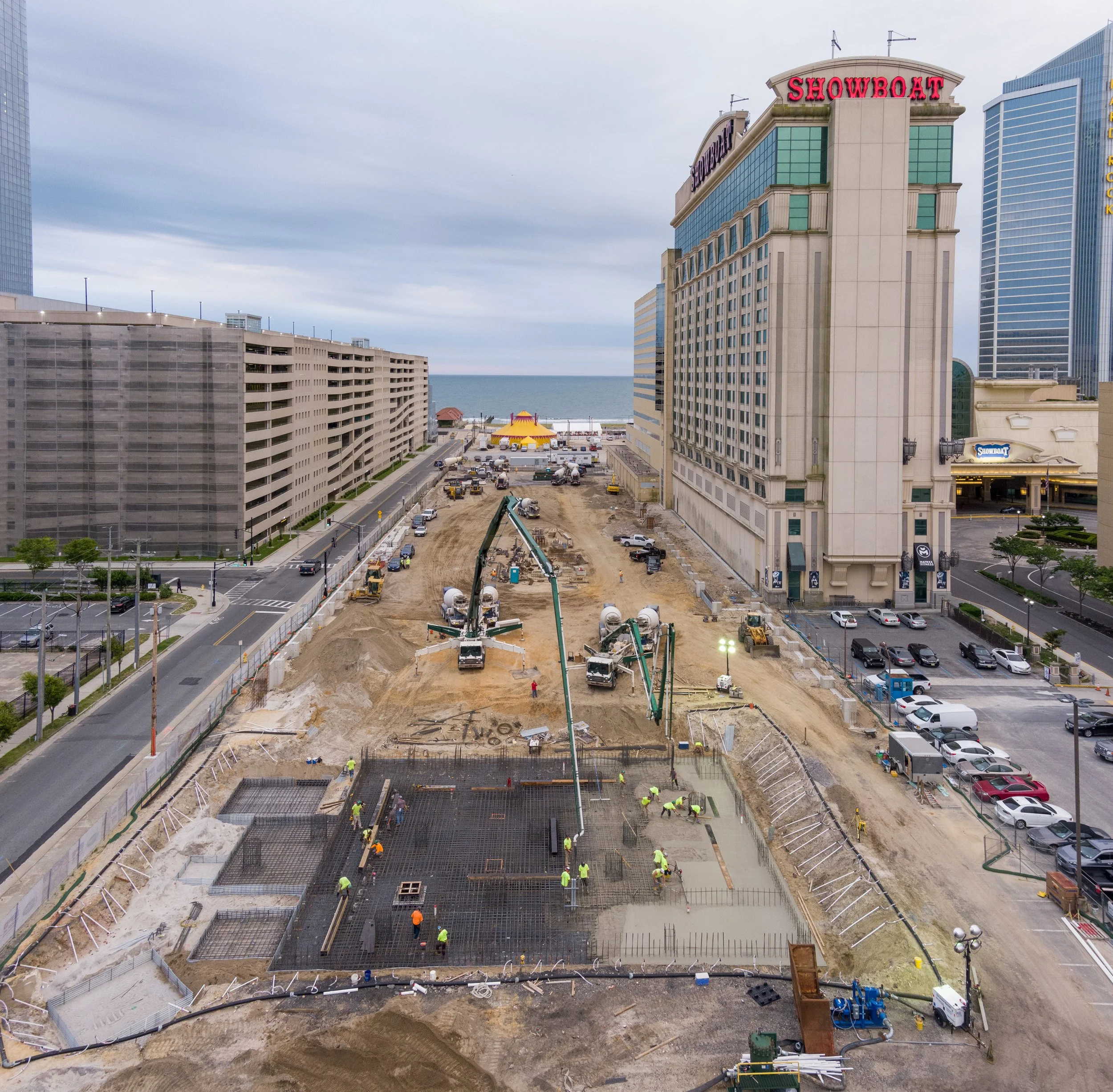 At this Atlantic City water park-to-be, we arrived before dawn to watch more than a hundred cement trucks deliver concrete. Months later, we returned to photograph the site after the slides and water had been added.