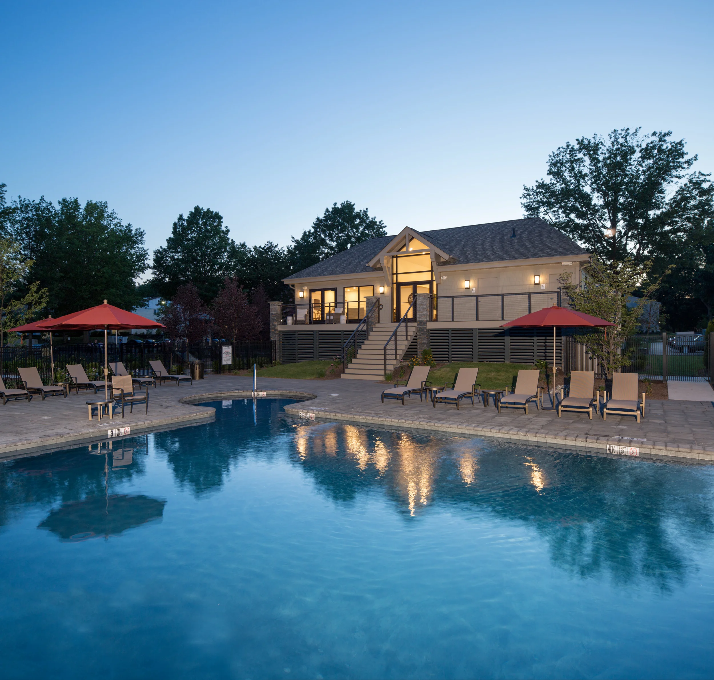 Greg used an elevated view to fully showcase the inviting spread of “new” clubhouse, pool, lounge chairs, umbrellas, hardscaping and landscaping. For dusk shots, orange gel filters add a warm glow while battery-powered flash technology prevents shadows under furniture.