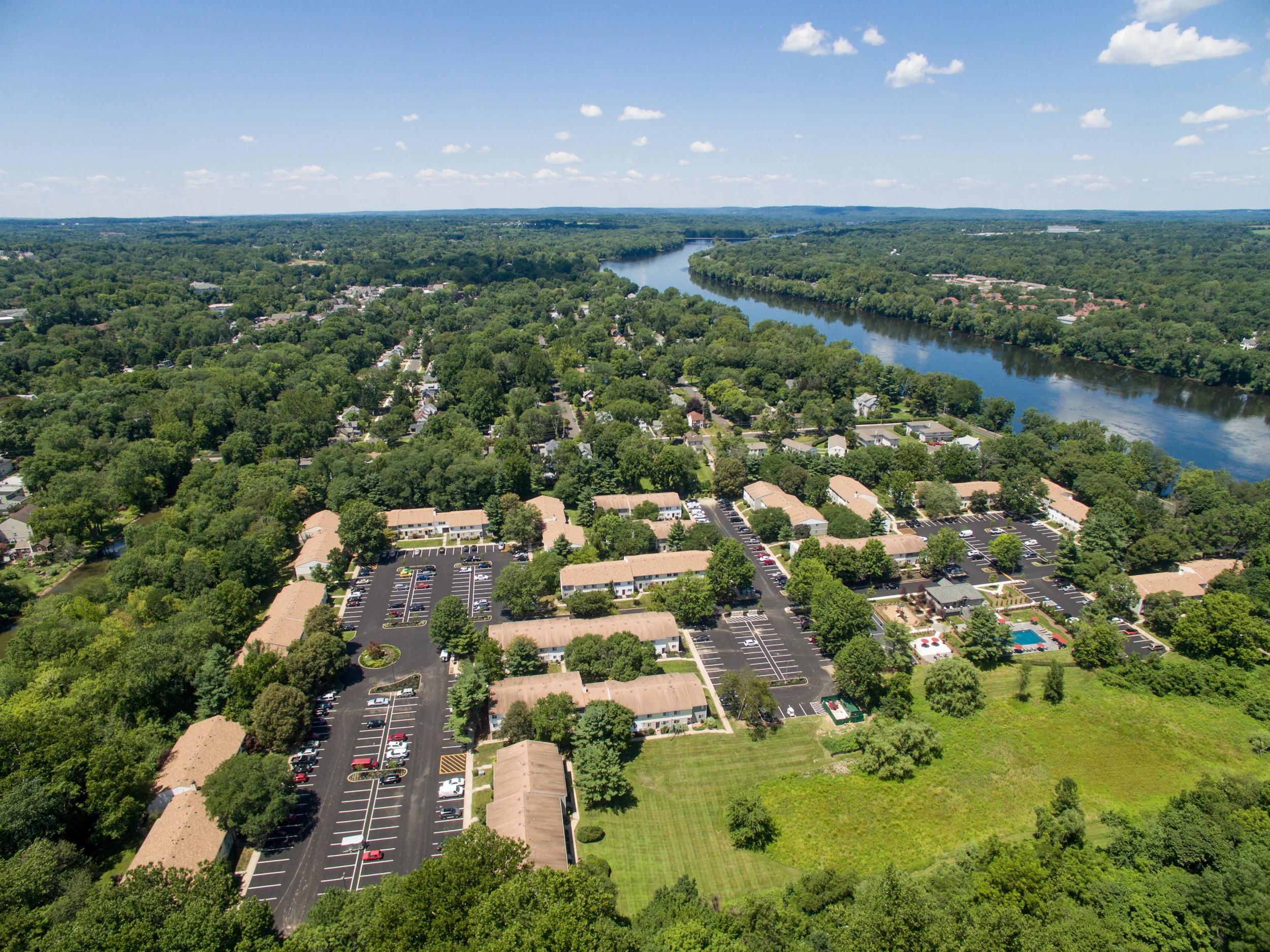 From above, the whole complex is embraced by greenery and ample parking as the Delaware River reflects clouds in the near distance. Interior images exhibit bright, cheery spaces accessorized with shiny new appliances, cabinetry and wood floors. The project’s interior designer assisted with staging and styling shots that encourage prospective residents to visually inhabit the space and make it home.